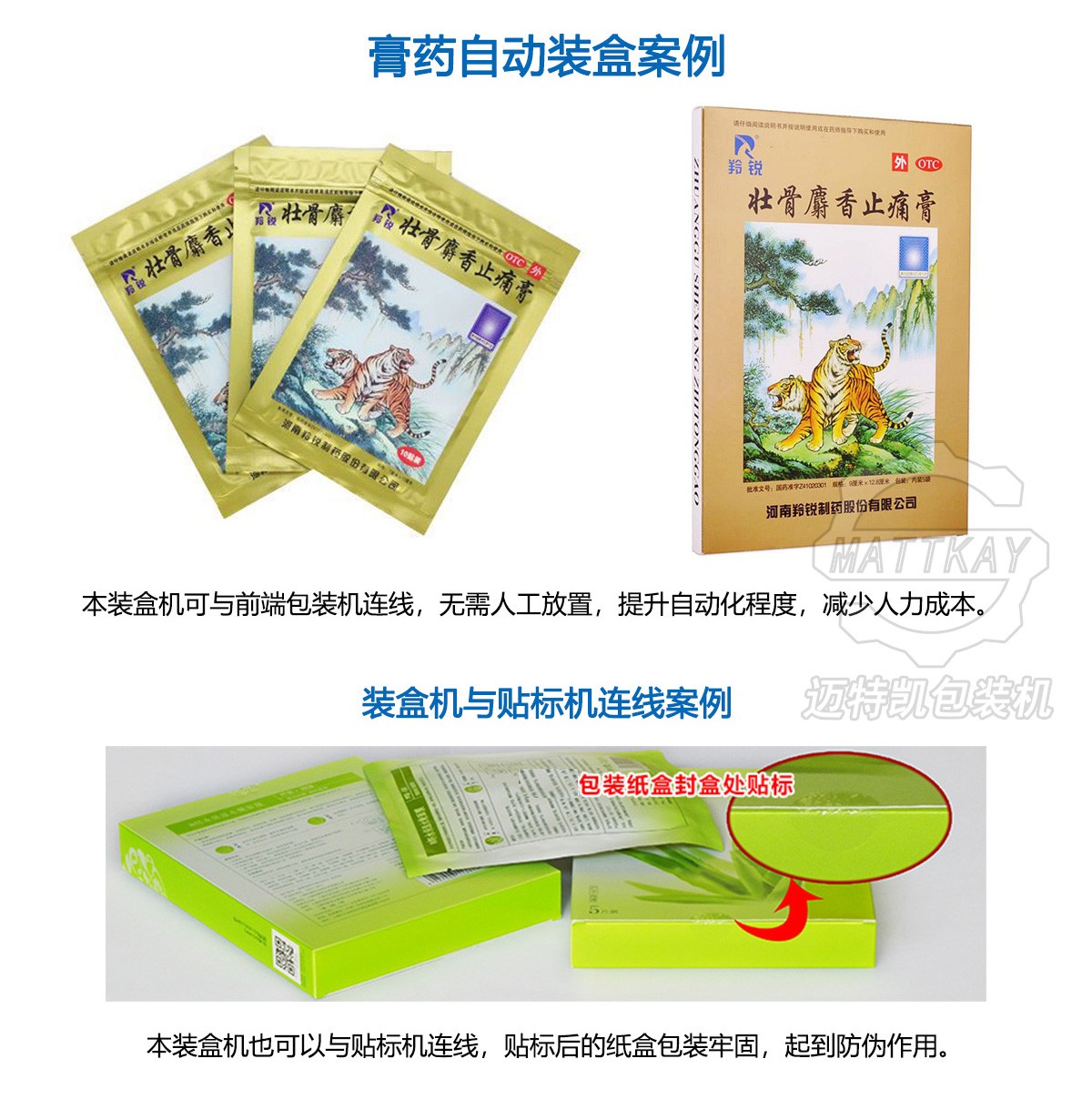 邁特凱膏藥裝盒機是一款專門為膏藥貼、退熱貼、面膜等片狀產品設計定制的自動化紙盒包裝機,本機具備自動數片、自動開盒、裝盒、封盒等功能,用戶可根據需求加配袋裝機、貼標機、噴碼機等。膏藥裝盒機包裝速度在10-100盒/分鐘內可根據產品需求設置穩定包裝速度,外觀采用優質鋼材及不銹鋼制造,可調節的紙盒槽機構,適應包裝紙盒大小,手動即可調節,方便快捷。折盒進料機構,設有無產品物料下紙盒,確保紙盒不會出現空物料包裝。