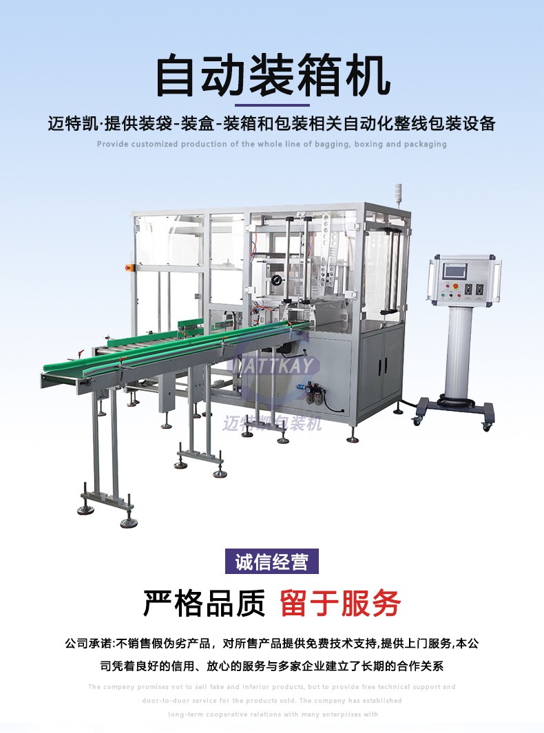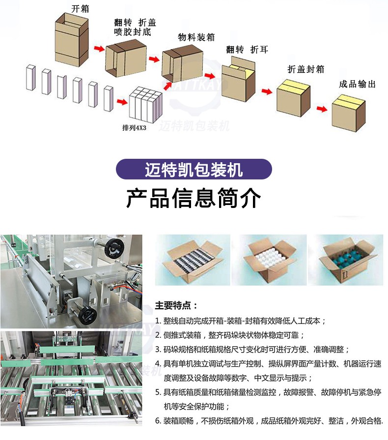 本自動裝箱機是采用紙箱側(cè)翻、產(chǎn)品平推式入箱方式裝箱,其中涉及產(chǎn)品來料、理料、推料、紙箱翻轉(zhuǎn)等機構(gòu),裝箱機采用PLC控制,無須人工千預(yù);此外設(shè)備可以根據(jù)客戶裝箱要求,在前期排列整理過程中即可自動完成所需的裝箱方式整理。